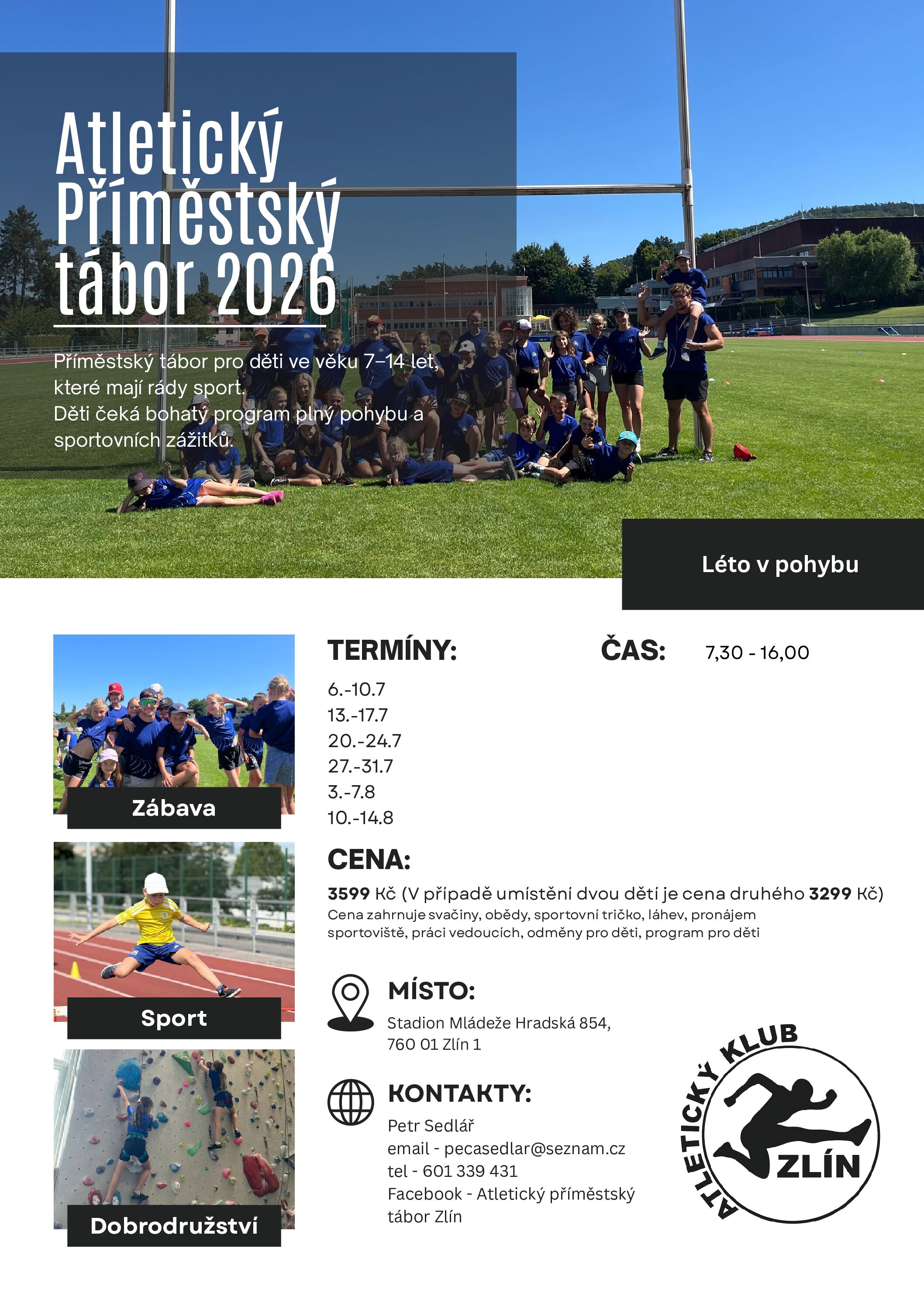 O letošních letních prázdninách jsme pro děti připravili 6 turnusů atletických příměstských táborů AK Zlín. Čeká je týden plný pohybu, sportu, her a zábavy v bezpečném prostředí atletického stadionu. Základní informace 📅 Termíny (6 turnusů): […]